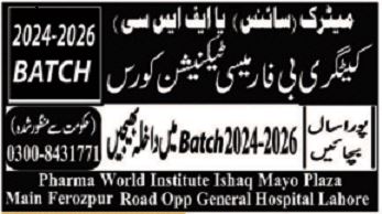 Pharma World Institute has announced admissions 2025 for Pharmacy Technician. Students can enroll for admissions in Pharma World Institute Lahore Punjab Pakistan for academic year 2025 to continue campus based or online education in Science College. Students for admissions in & criteria can apply as per Private institute admission policy 2025 before closing date as per advertisement. Read newspaper ad for exact details.