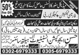 Hassan Education Institute of Health Science has announced admissions 2023 for Pharmacy Technician. Eligible students can apply for academic admissions 2023 in Hassan Education Institute of Health Science Lahore Kasur Punjab Pakistan for Medical Diploma. Students who want to enroll for academic session 2023 in Diploma qualification and admission criteria for Private institute can apply till last date 23 August 2023. Read newspaper ad for exact details.