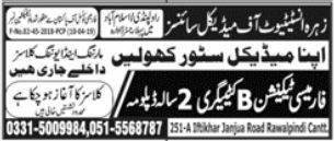 Zahra Institute of Medical Sciences Pharmacy Technician admissions 2024 has been started. Students can enroll for admissions in Zahra Institute of Medical Sciences Rawalpindi Punjab Pakistan for academic year 2024 to continue campus based or online education in Medical Diploma. Students for admissions in Diploma can apply for online or campus classes as per Private institute criteria till admission closing date November 4, 2024. Read newspaper ad for exact details.