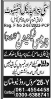 City Paramedical Institute CPI Pharmacy Technician Category B admissions 2023 has been started. City Paramedical Institute CPI Multan Punjab Pakistan welcomes students to apply for admissions in academic year 2023 in Management University. Students for admissions in P.G Diploma and Course can apply for online or campus classes as per Private institute criteria till admission closing date January 27, 2024. Read newspaper ad for exact details.