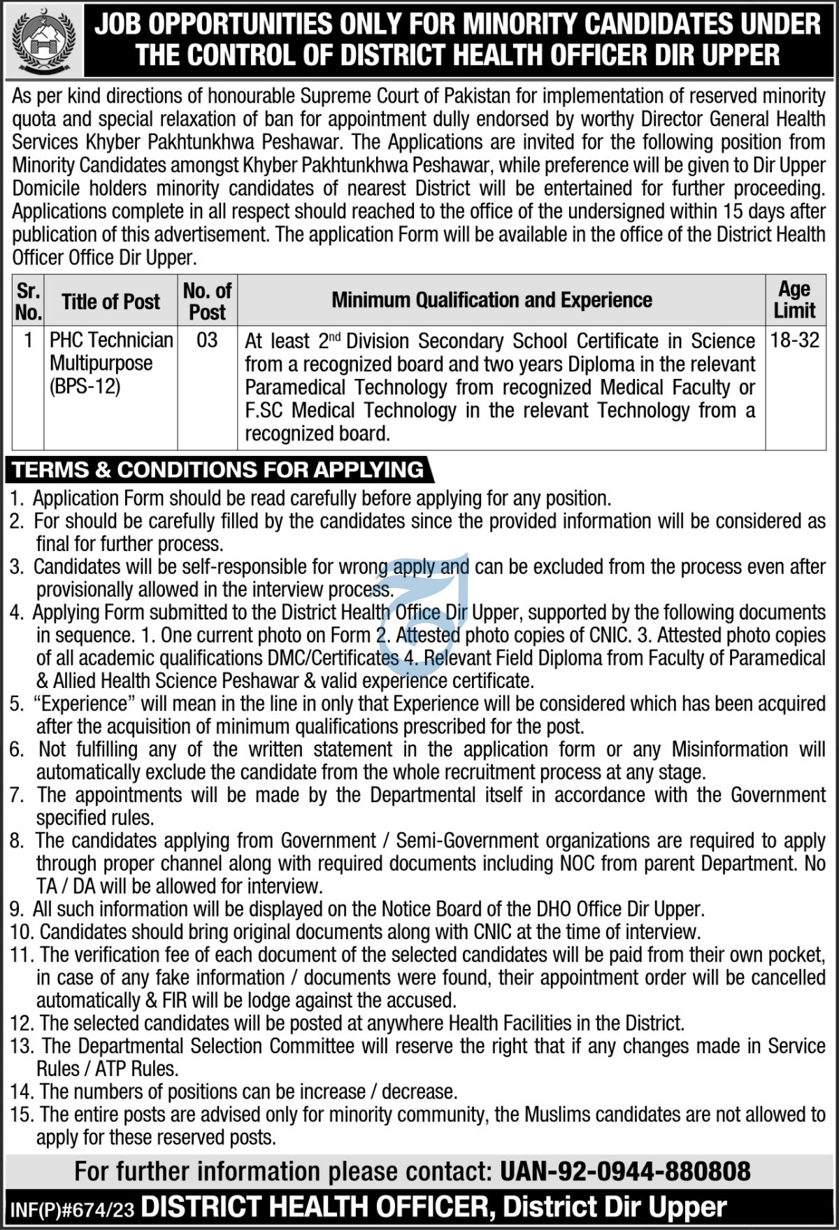 Office of District Health Officer Upper Dir, upper dir Khyber Pakhtunkhwa KPK Pakistan invites applications from eligible candidates for the post of phc technician as per advertisement of March 4, 2023 published in daily Aaj Newspaper. Persons with Others and Matric etc. education can apply.