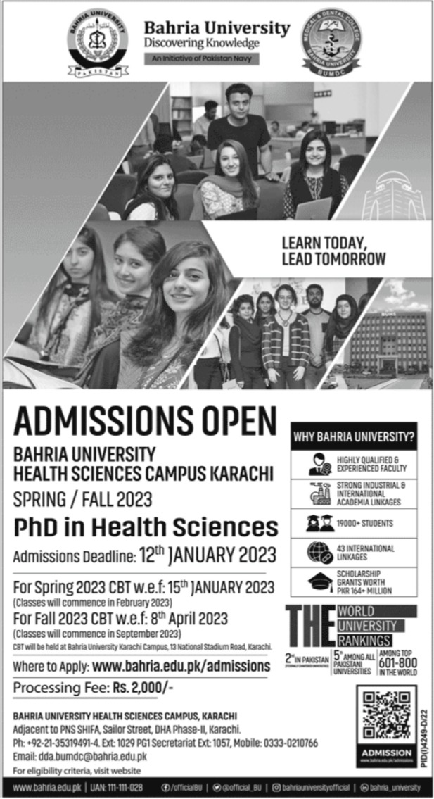 Admissions in Bahria University 2023 for PhD in Health Sciences has been announced. Eligible students who qualify as per admission criteria in Bahria University Karachi Sindh Pakistan can apply in Medical University for academic year 2023. Eligible candidates for admissions in Phd can apply as per Private institute criteria and before closing date 12 January 2023 after reading advertisement online. Read newspaper ad for exact details.