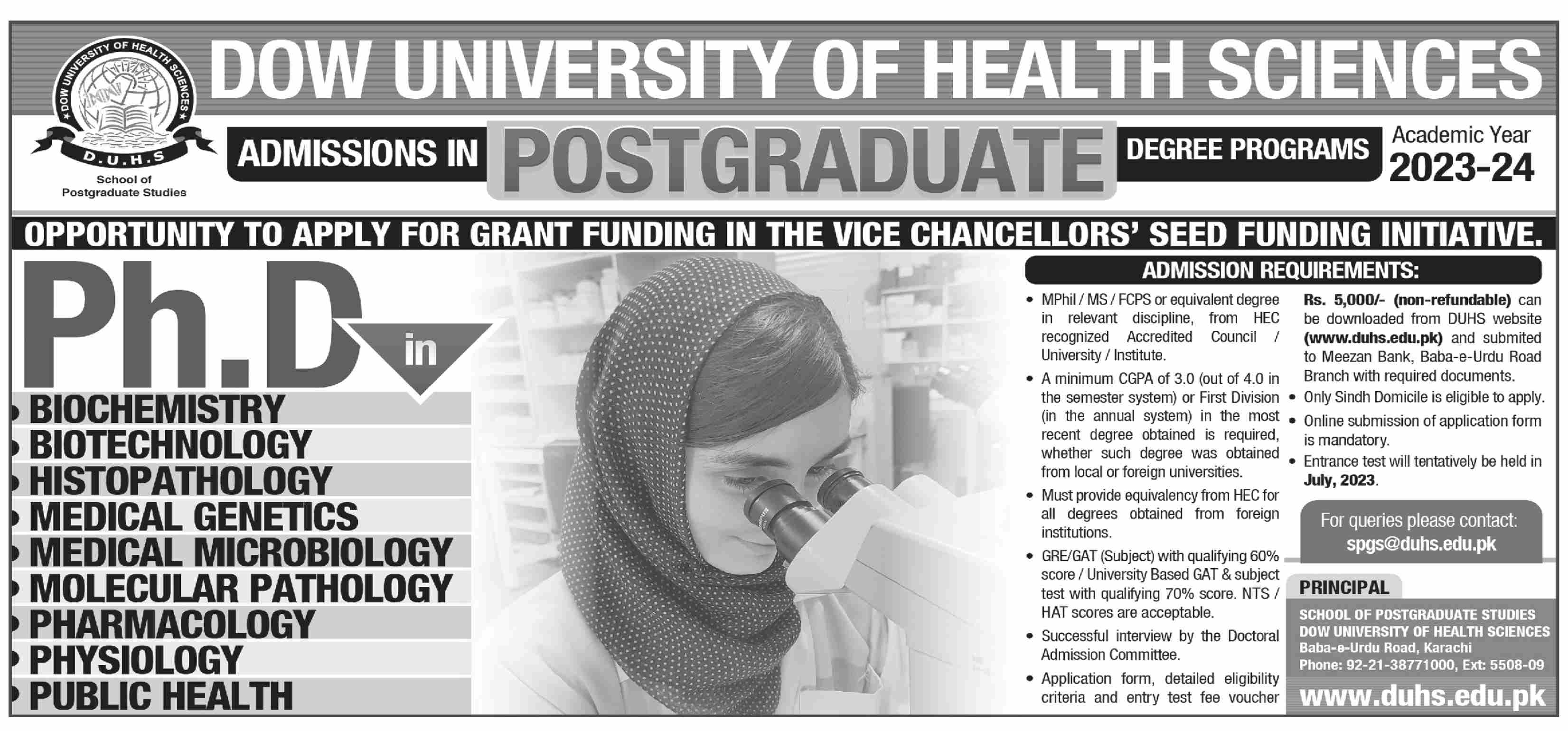 Dow University of Health Sciences has announced admissions 2023 for PhD Biochemistry, PhD Biotechnology, PhD Histopathology, PhD Medical Genetics, PhD Medical Microbiology, PhD Molecular Pathology. Students can enroll for admissions in Dow University of Health Sciences Karachi Sindh Pakistan for academic year 2023 to continue campus based or online education in Medical University. Students who want to enroll for academic session 2023 in Phd qualification and admission criteria for Government institute can apply till last date 22 May 2023. Read newspaper ad for exact details.