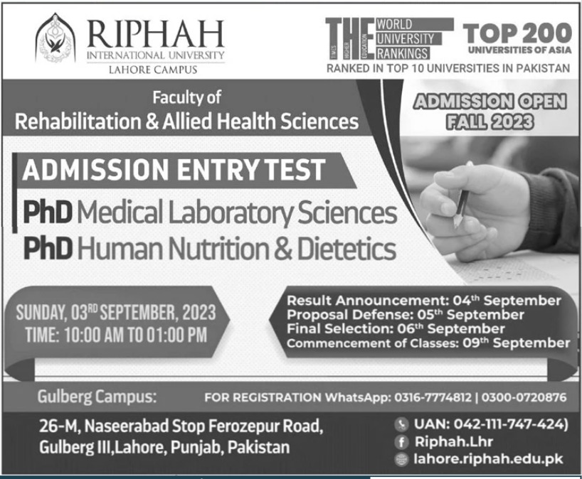 Riphah International University PhD Medical Laboratory Sciences, PhD Human Nutrition and Dietetics admissions 2023 has been started. Eligible students who qualify as per admission criteria in Riphah International University Lahore Punjab Pakistan can apply in Science University for academic year 2023. Eligible students for fulfilling criteria for admissions in Phd can enroll as per Private admission policy 2023 till closing date 31 August 2023. Read newspaper ad for exact details.