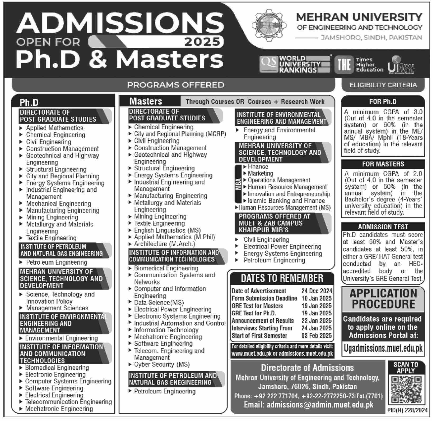 Mehran University PHD & MASTERS admissions 2024 has been announced. Students can enroll for admissions in Mehran University Jamshoro Sindh Pakistan for academic year 2024 to continue campus based or online education in Engineering University. Students for admissions in Master and Phd can apply for online or campus classes as per Government institute criteria till admission closing date. Read newspaper ad for exact details.