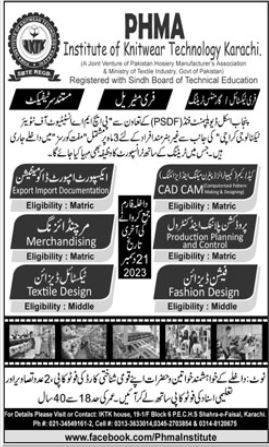 PHMA Institute of Knitwear Technology Karachi has announced admissions 2023 for Technical Short Courses of Textile, Garments Designing, Cad CAm Computerized Pattern Making & Designing, Production Planning and Control, Merchandising, Export and Import Documentation, Fashion Desinging, Textile Designing. Eligible students can apply for academic admissions 2023 in PHMA Institute of Knitwear Technology Karachi Karachi Sindh Pakistan for Technical College. Students for admissions in Diploma and Course & criteria can apply as per Government institute admission policy 2023 before closing date December 21, 2023 as per advertisement. Read newspaper ad for exact details.
