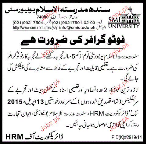 Photographers Job In Sindh Madressatul Islam University