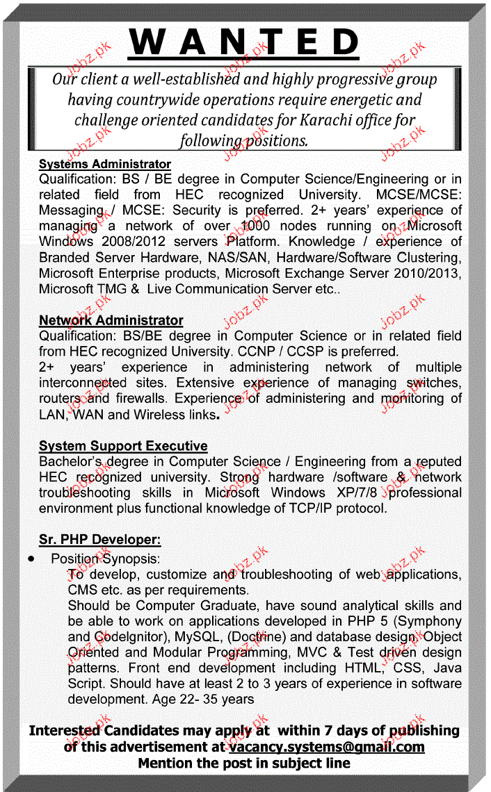 Apply as per details in job advertisement. Login to view further details of how to apply via https://www.jobz.pk online.