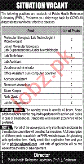 Public Health Reference Laboratory PHRL Peshawar, Government of the KPK require individual for the posts of Molecular Biologist, Lab Technologist, Microbiologist, Junior Molecular Biologist, Lab Superintendent, Junior Microbiologist, Lab Technician, Lab Assistant, Database Administrator, Office Assistant, Computer Operator, Account Assistant, Research Associate, Store Keeper, Naib Qasid, Office Boy, Janitor, Sweeper.