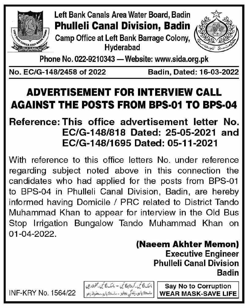 Irrigation Department is looking for candidates for following posts as per job advertisement published in daily Dawn Newspaper of March 26, 2022 for location Badin, hyderabad and badin Sindh Pakistan:
