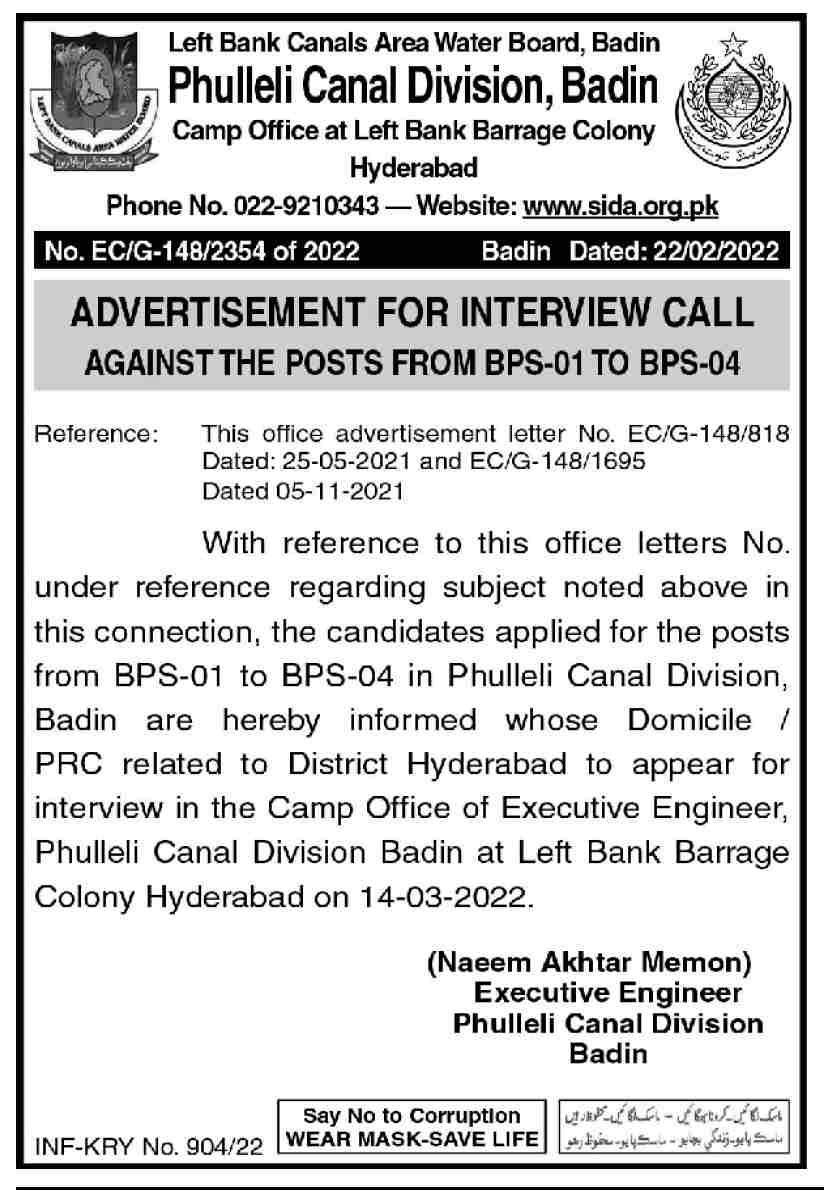 Phulleli Canal Division invites applications for job positions advertised in daily Dawn dated 26 February 2022 for following vacancies in Badin, badin Sindh Pakistan.
