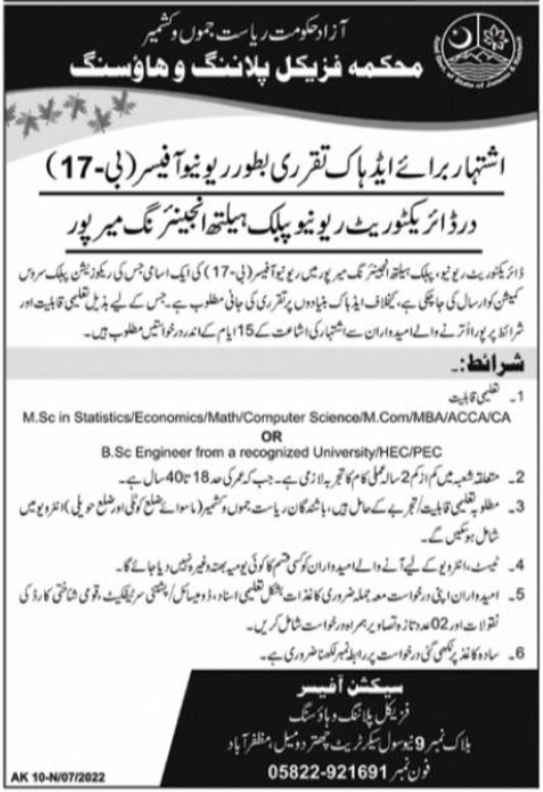 Physical Planning & Housing Department jobs advertisement dated about 16 July 2022 in daily Nawaiwaqt Newspaper invites application for the vacant post of revenue officer in Mirpur, muzaffarabad AJK Pakistan. Preferred Education is ACCA, M.com, M.sc, MBA, CA and B.E etc.