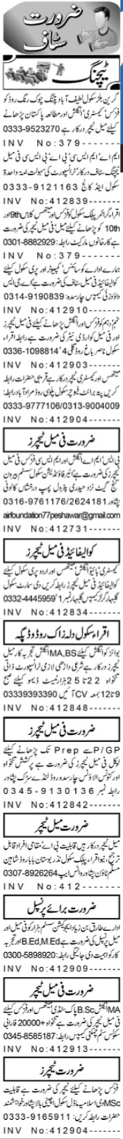 Private School Peshawar, peshawar Khyber Pakhtunkhwa KPK Pakistan invites applications from eligible candidates for the post of physics teacher, teacher, pak studies teacher, chemistry teacher, computer science teacher, pakistan study teacher, science teacher, principal, english teacher, prep class teacher, female coordinator, teaching staff, preschool teacher, lady teacher, mathematics teacher, urdu teacher and biology teacher as per advertisement of September 15, 2022 published in daily Aaj Newspaper. Candidates with Master and Bachelor etc. educational background will be preferred.