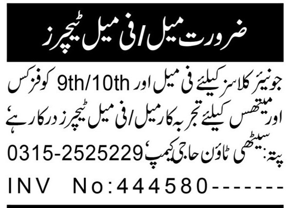 Private School jobs advertisement dated about 28 August 2025 in daily Aaj Newspaper invites application for the vacant post of mathematics teacher, female teacher, teacher and physics teacher in Sathee Town Peshawar, peshawar Khyber Pakhtunkhwa KPK Pakistan. Candidates with Bachelor and Master etc. educational background will be preferred.