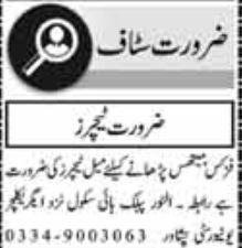 Al Noor Public School Peshawar, peshawar Khyber Pakhtunkhwa KPK Pakistan invites applications from eligible candidates for the post of physics teacher, teacher and mathematics teacher as per advertisement of December 4, 2025 published in daily Mashriq Newspaper. Educational qualifications required Bachelor and Master etc.