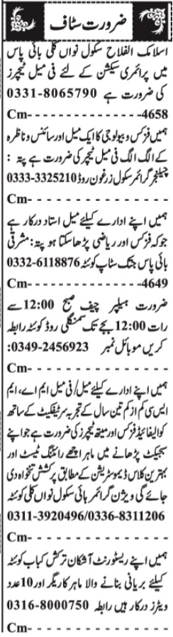 Private Company jobs advertisement dated about 1 May 2024 in daily Jang Newspaper invites application for the vacant post of primary teacher, science teacher, physics teacher, mathematics teacher, helper, nazra teacher, biology teacher, female teacher, waiter and teacher in Quetta, quetta Balochistan Pakistan. M.sc, Matric, BA, Master, Middle, MA and Bachelor etc. educational qualification will be preferred.