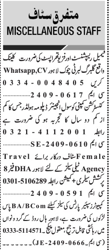 Private Company jobs advertisement dated about 25 September 2024 in daily Jang Newspaper invites application for the vacant post of civil engineer, physiotherapist, salesman, engineer, telesales officer and receptionist in Lahore, lahore Punjab Pakistan. Candidates with Intermediate, Bachelor, Matric and Master etc. educational background will be preferred.