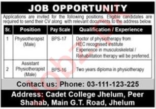 Cadet College Jhelum is looking for candidates for following posts as per job advertisement published in daily Jang Newspaper of July 20, 2025 for location GT Road Jhelum, jhelum Punjab Pakistan: