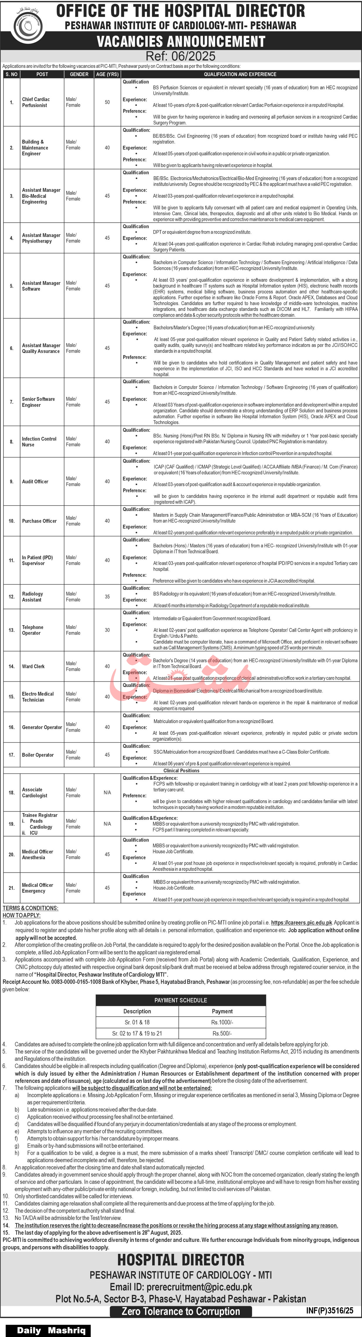 Medical Teaching Institution MTI, Peshawar Institute of Cardiology PIC Hayatabad Phase 5 Peshawar, peshawar Khyber Pakhtunkhwa KPK Pakistan invites applications from eligible candidates for the post of assistant manager quality assurance, infection control nurse, building engineer, maintenance engineer, assistant manager software, in patient supervisor, assistant manager, radiology assistant, purchase officer, boiler operator, chief cardiac perfusionist, medical officer, ipd supervisor, telephone operator, audit officer, associate cardiologist, assistant manager biomedical engineering, electro medical technician, generator operator, ward clerk, medical officer anesthesia, assistant manager physiotherapy, software engineer, trainee registrar and medical officer emergency as per advertisement of August 14, 2025 published in daily Mashriq Newspaper. Preferred Education is B.E, MBA, MBBS, Intermediate, Others, M.com, Bachelor, Matric, DPT, Master, ACCA and DAE etc.