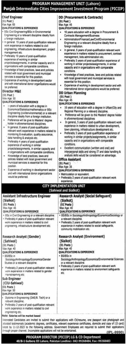Vacant posts including sub engineer, deputy director contracts, research analyst, office assistant, assistant infrastructure engineer, research analyst social safeguard, deputy director urban planning, research analyst environment, chief engineer, deputy director procurement, research analyst gender, director evaluation and director monitoring are announced in Local Government & Community Development Department Sahiwal, sahiwal and sialkot Punjab Pakistan as per 25 November 2023 advertisement in daily Nawaiwaqt Newspaper. Preferred Education is Bachelor, Others and Master etc.