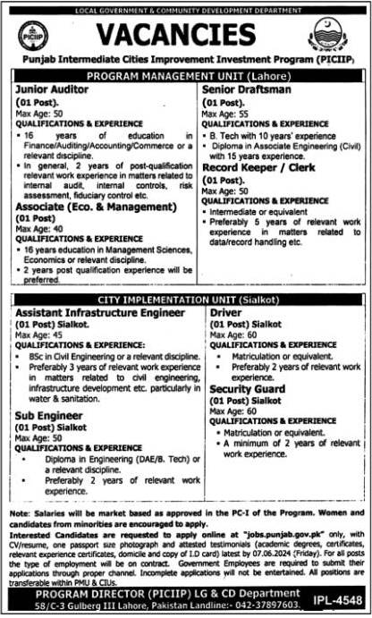 Local Government & Community Development Department Lahore, sialkot Punjab Pakistan invites applications from eligible candidates for the post of clerk, associate, record keeper, draftsman, assistant infrastructure engineer, sub engineer, auditor, security guard and driver as per advertisement of May 20, 2024 published in daily Nation Newspaper. Educational qualifications required MA, Bachelor, MBA, M.com, DAE, B.E, Matric, Intermediate, M.sc and Master etc.