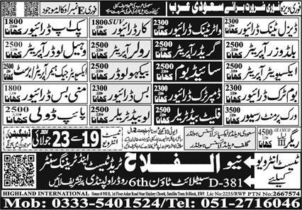 Vacant posts including diesel tank driver, side boom operator, grader operator, backhoe loader operator, htv driver, low bed trailer, rigger, excavator jack hammer operator, water tank driver, boom truck driver, pickup driver, wheel loader operator, dumper truck driver, car driver, mini bus driver, roller operator, excavator operator, bus driver, work permit receiver, driver, bulldozer operator, pipe dooli, backhoe loader and fleet bed trailer are announced in New Al Falah Trade Test & Training Center Riyadh, jeddah Saudi Arabia as per 19 July 2024 advertisement in daily Express Newspaper. Preferred Education is DAE, Matric, B.E, Bachelor and Intermediate etc.