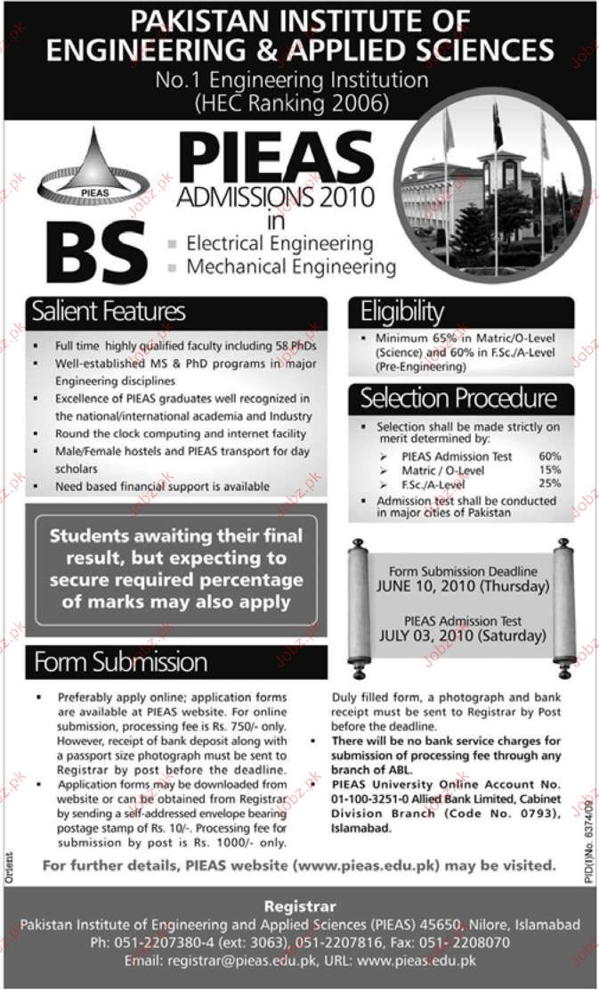 Electrical Engineering and Mechanical Engineering in PIEAS Islamabad Read newspaper ad for exact details.