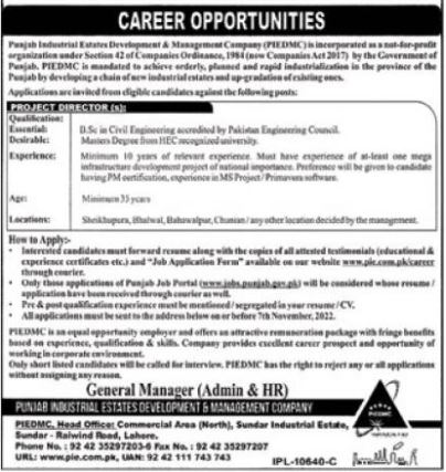 Punjab Industrial Estates Development and Management Company PIEDMC jobs advertisement dated about 22 October 2022 in daily Nation Newspaper invites application for the vacant post of project director in Lahore, lahore Punjab Pakistan. Persons with Bachelor etc. education can apply.