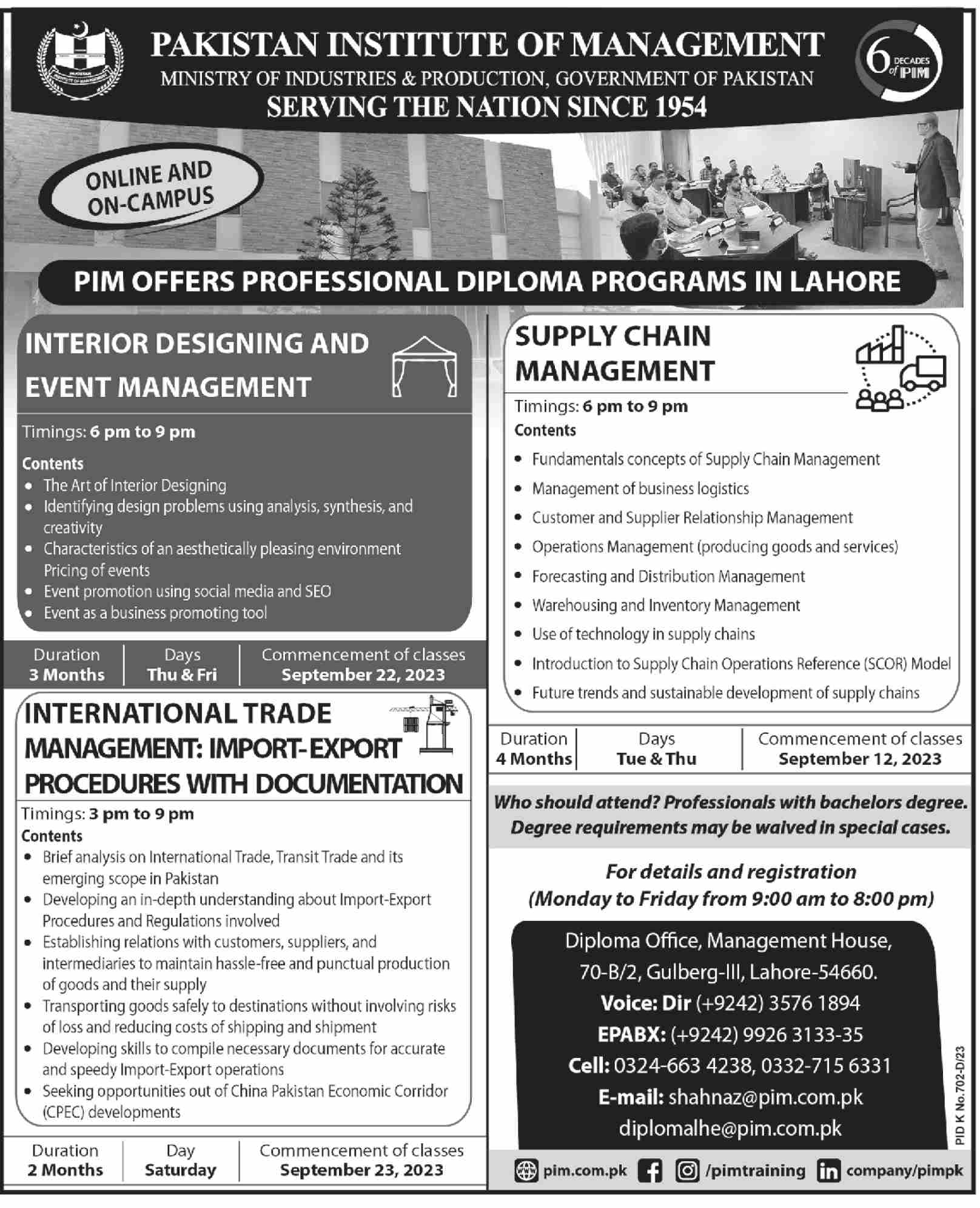 Pakistan Institute of Management Professional Diploma and certification Courses in Interior Design And Event Management, Supply Chain Management, International Trade Management, Import-Export Procedures with Documentation, admissions 2023 has been started. Eligible students who qualify as per admission criteria in Pakistan Institute of Management Larkana Lahore Punjab Pakistan can apply in Management Course for academic year 2023. Students for admissions in Diploma and Course can apply for online or campus classes as per Government institute criteria till admission closing date September 8, 2023. Read newspaper ad for exact details.