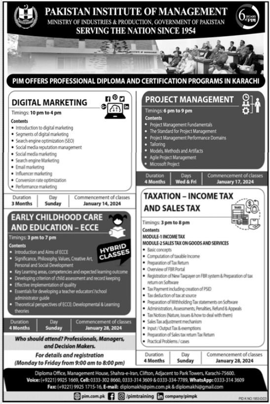 Pakistan Institute of Management PIM Professional Diploma & Certification Course of Digital Marketing, Project Management, Taxation, Income Tax And Sales Tax, Early Childhood Care And Education ECCE admissions 2024 has been announced. Eligible students who qualify as per admission criteria in Pakistan Institute of Management Karachi Sindh Pakistan can apply in Management Course for academic year 2024. Students for admissions in Diploma and Course & criteria can apply as per Government institute admission policy 2024 before closing date January 12, 2024 as per advertisement. Read newspaper ad for exact details.