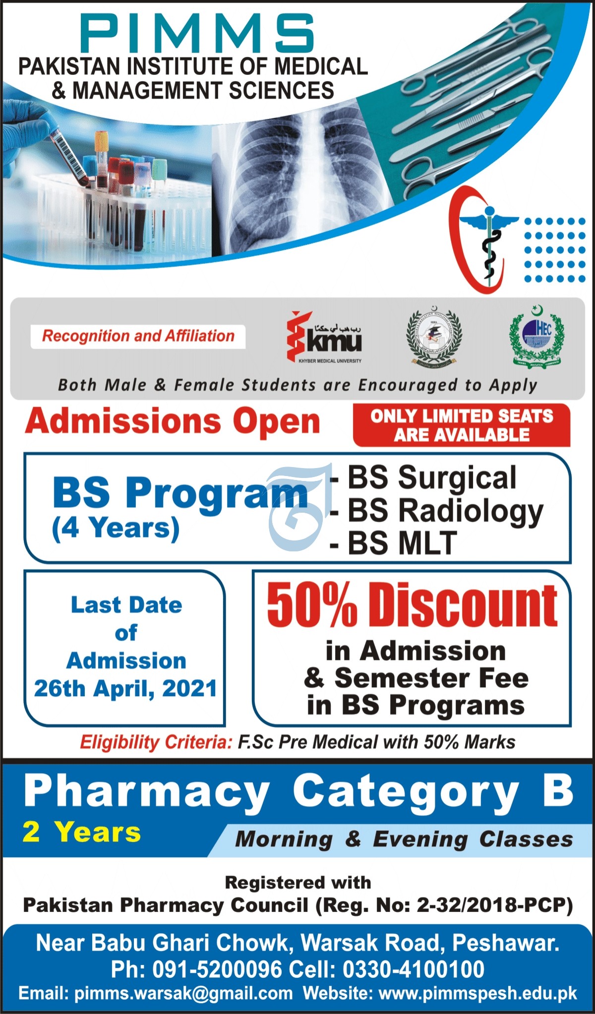 Pakistan Institute of Medical and Management Sciences PIMMS invites applications for admissions in BS Surgical, BS Radiology & BS MLT in Peshawar KPK 2021. Read newspaper ad for exact details.