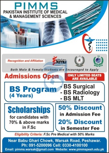 Pakistan Institute of Medical and Management Sciences PIMMS is offering online admissions in BS Surgical, BS Radiology & BS MLT in Peshawar Khyber Pakhtunkhwa KPK 2021. Read newspaper ad for exact details.