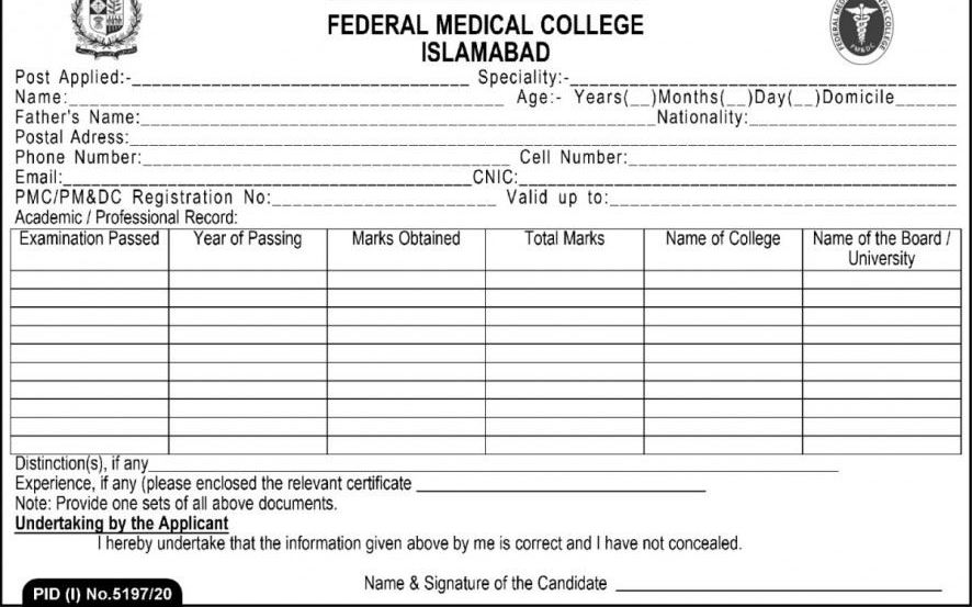 Federal Medical Teaching Institute FMTI Islamabad, Federal Medical College FMC, Pakistan Institute of Medical Sciences PIMS, Government of Pakistan is looking for the services from experienced candidates for the posts of Professor, Associate Professor, Assistant Professor, Director, Director Establishment, Lab Attendant.