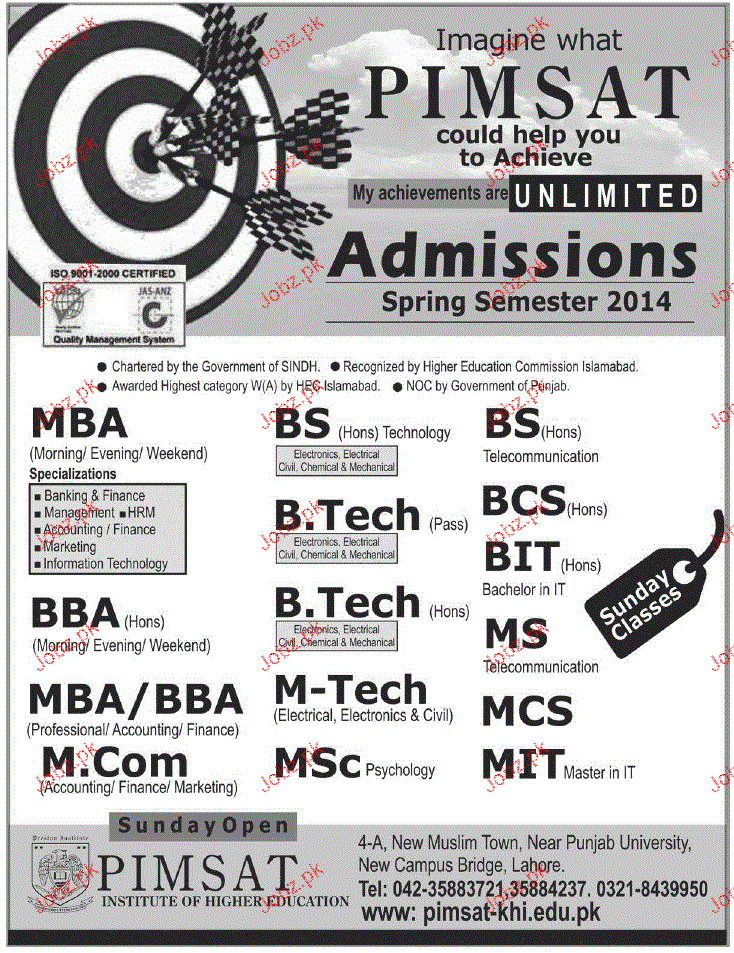 PIMSAT Institute of Higher Education Admission in MBA, BS, BBA, MS, BIT, MS, MCS, M.COm, MSc and MIT in Lahore Read newspaper ad for exact details.