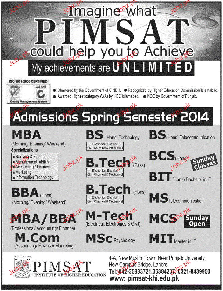 PIMSAT Institute of Higher Education Admission in MBA, BS, BCS, BBA, MS, MIT, M.Com and BIT in Lahore Read newspaper ad for exact details.