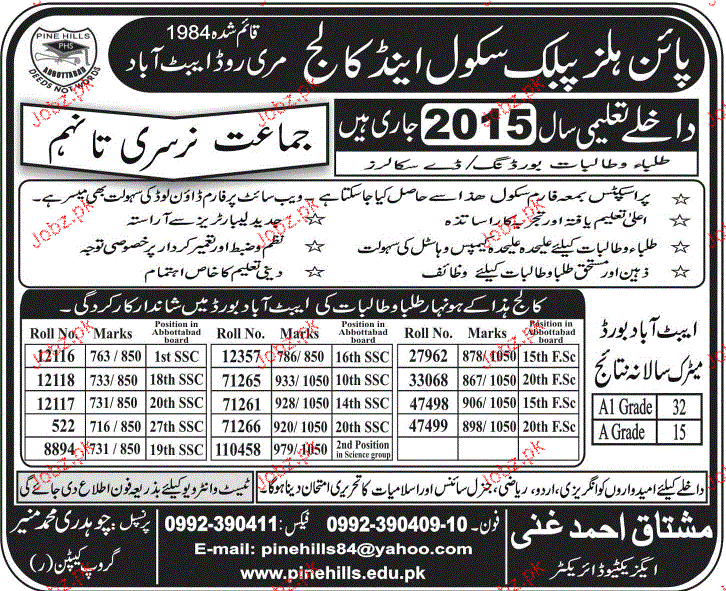 Pine Hills Public School and College Admission in Nursery to ix IN aBBOTTABAD. Read newspaper ad for exact details.