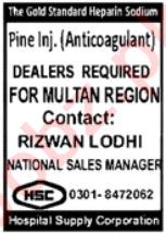 Pine Inj Anticoagulant Dealer Jobs in HSC Multan