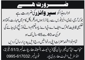 Pine Match Pvt Ltd jobs advertisement dated about 15 May 2025 in daily Aaj Newspaper invites application for the vacant post of supervisor in Haripur, haripur Khyber Pakhtunkhwa KPK Pakistan. BA, Bachelor and Intermediate etc. educational qualification will be preferred.