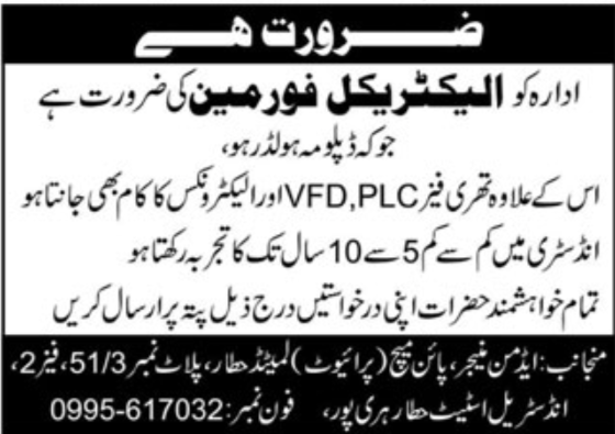 Pine Match Pvt Ltd jobs advertisement dated about 25 July 2025 in daily Aaj Newspaper invites application for the vacant post of electrical foreman in Haripur, haripur Khyber Pakhtunkhwa KPK Pakistan. Educational qualifications required Matric, Primary and Middle etc.