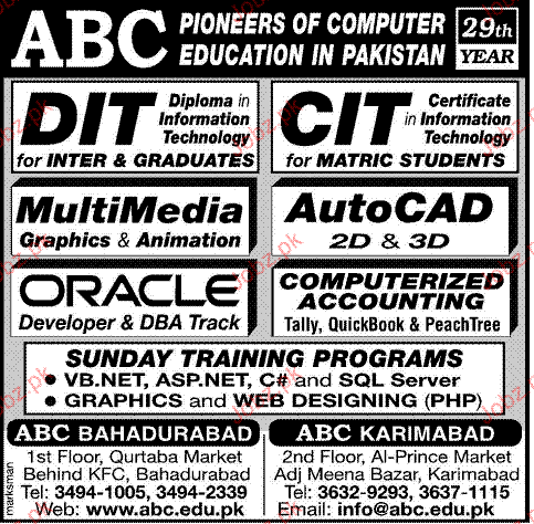 Pioneer of COmputer Education in Pakistan Admission in DIT, CIT and Autocad in Karachi Read newspaper ad for exact details.