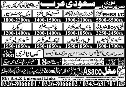MS SAZ Universal Links Riyadh, riyadh Saudi Arabia invites applications from eligible candidates for the post of mechanical technician, pipe fitter, multi welder, work permit receiver, mechanical fabricator, ehss engineer, tank fabricator, alloy welder, shutdown project coordinator, millwright technician, rigger, mechanical fitter and pipe fabricator as per advertisement of September 11, 2024 published in daily Express Newspaper. Middle, Matric and Intermediate etc. educational qualification will be preferred.