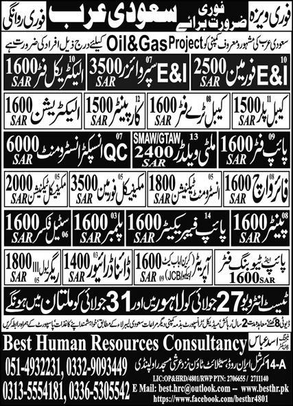 Best Human Resources Consultancy invites applications for job positions advertised in daily Express dated 25 July 2024 for following vacancies in Riyadh, jeddah Saudi Arabia.