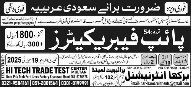 Barkha International Pvt Ltd invites applications for job positions advertised in daily Express dated 17 July 2025 for following vacancies in Dammam, al khobar Saudi Arabia.