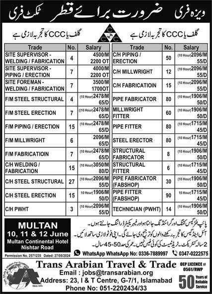 Trans Arabian Travel & Trade Company jobs advertisement dated about 7 June 2024 in daily Express Newspaper invites application for the vacant post of site foreman, site supervisor welding, pipe fitter, pipe fabricator, site supervisor piping, chargehand piping, millwright fitter, foreman fabrication, chargehand fabrication, chargehand welding, site supervisor erection, foreman steel structural, chargehand steel erection, foreman steel erection, structural fitter, foreman piping, site supervisor, technician pwht, chargehand pwht, site supervisor fabrication, foreman millwright, chargehand millwright, chargehand steel structural, steel erector, foreman erection and structural fabricator in Doha, doha Qatar. Persons with Matric, Intermediate, B.E, Bachelor and DAE etc. education can apply.