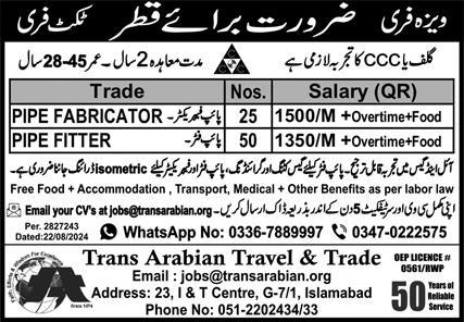 Trans Arabian Travel & Trade Company jobs advertisement dated about 7 December 2024 in daily Express Newspaper invites application for the vacant post of pipe fitter and pipe fabricator in Doha, doha Qatar. Educational qualifications required DAE, Matric and Intermediate etc.