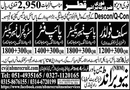 Vacant posts including pipe fitter, structural fabricator, scaffolder and pipe fabricator are announced in New Brand Manpower Doha, doha Qatar as per 13 December 2024 advertisement in daily Express Newspaper. Candidates with Intermediate, Matric, DAE and Bachelor etc. educational background will be preferred.