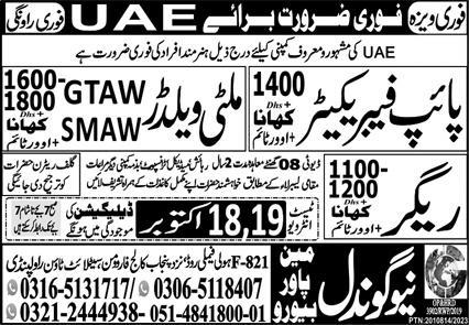 New Gondal Manpower Bureau is looking for candidates for following posts as per job advertisement published in daily Express Newspaper of October 13, 2023 for location Abu Dhabi, sharjah UAE: