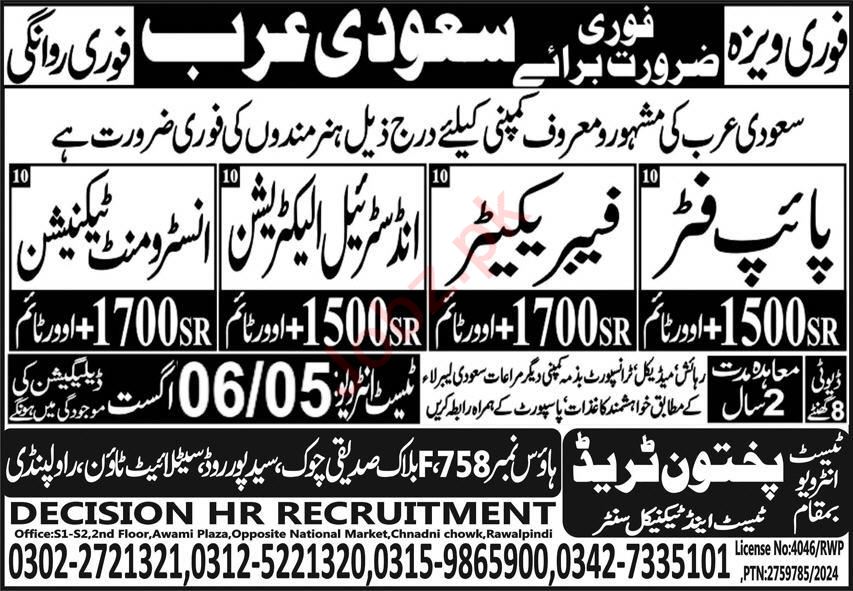 Pakhtoon Trade Test & Technical Center Madina, madina Saudi Arabia invites applications from eligible candidates for the post of fabricator, industrial electrician, instrument technician and pipe fitter as per advertisement of August 4, 2024 published in daily Express Newspaper. Persons with Middle and Primary etc. education can apply.