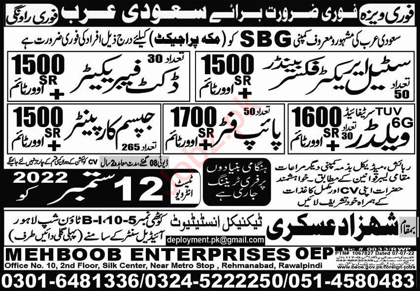 Mehboob Enterprises Overseas Employment Promoters invites applications for job positions advertised in daily Express dated 11 September 2022 for following vacancies in Riyadh, riyadh Saudi Arabia.