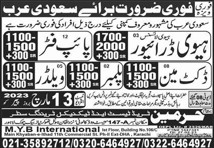 Harmain Trade Test & Technical Training Center jobs advertisement dated about 9 March 2023 in daily Express Newspaper invites application for the vacant post of docket man, plumber, welder, pipe fitter, heavy driver and driver in Al Khobar, riyadh Saudi Arabia. Persons with Intermediate and Matric etc. education can apply.